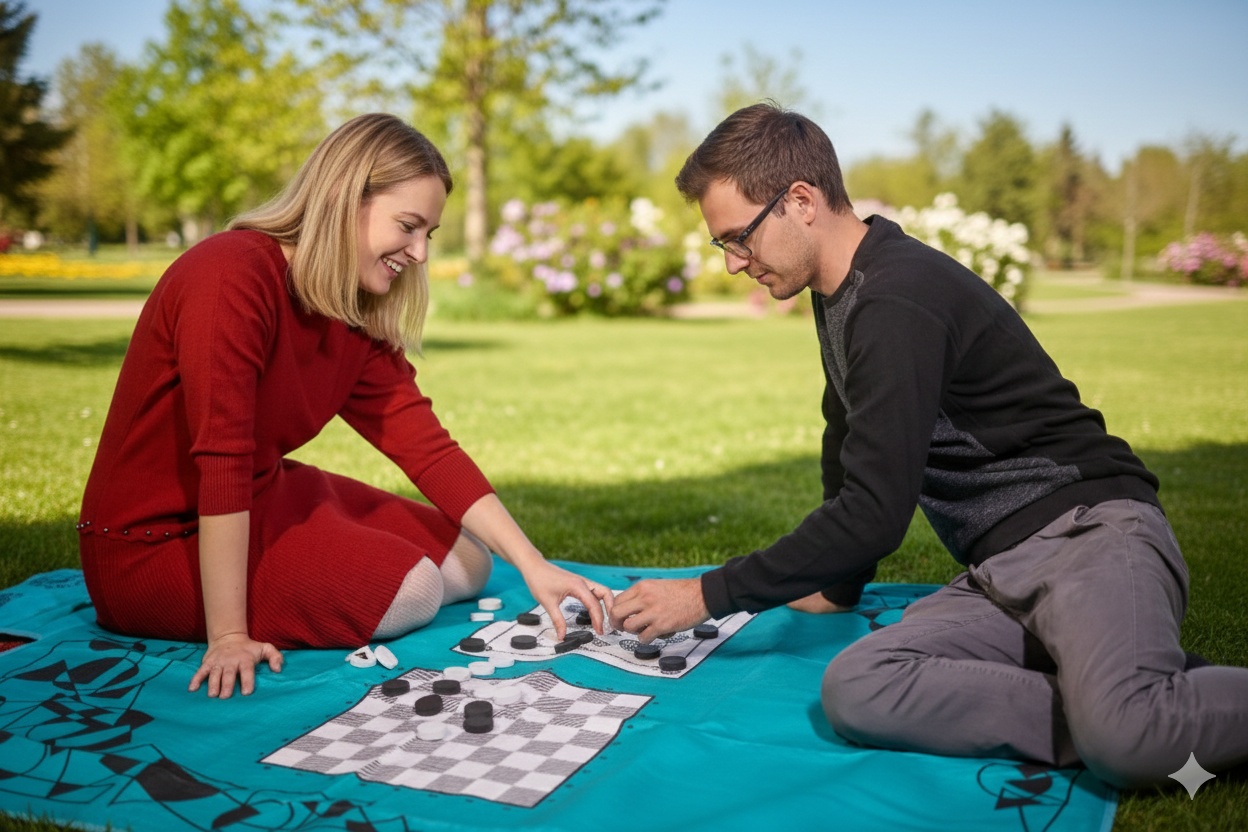 Mely egyesíti a játszószőnyegek, strand- és pikniktakarók kényelmét az olyan jól ismert játékokkal, mint a sakk, a malom vagy a Ki nevet a végén?